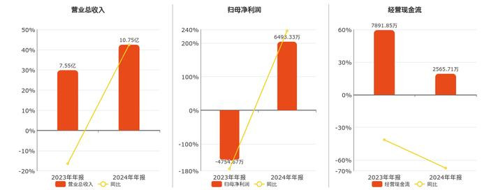 公司营业总收入为10.75亿元。归母净利润为6493.33万元。经营活动现金净流入为2565.71万元,较去年同报告期经营活动现金净流入减少5326.13万元,同比较去年同期下降67.49%。
